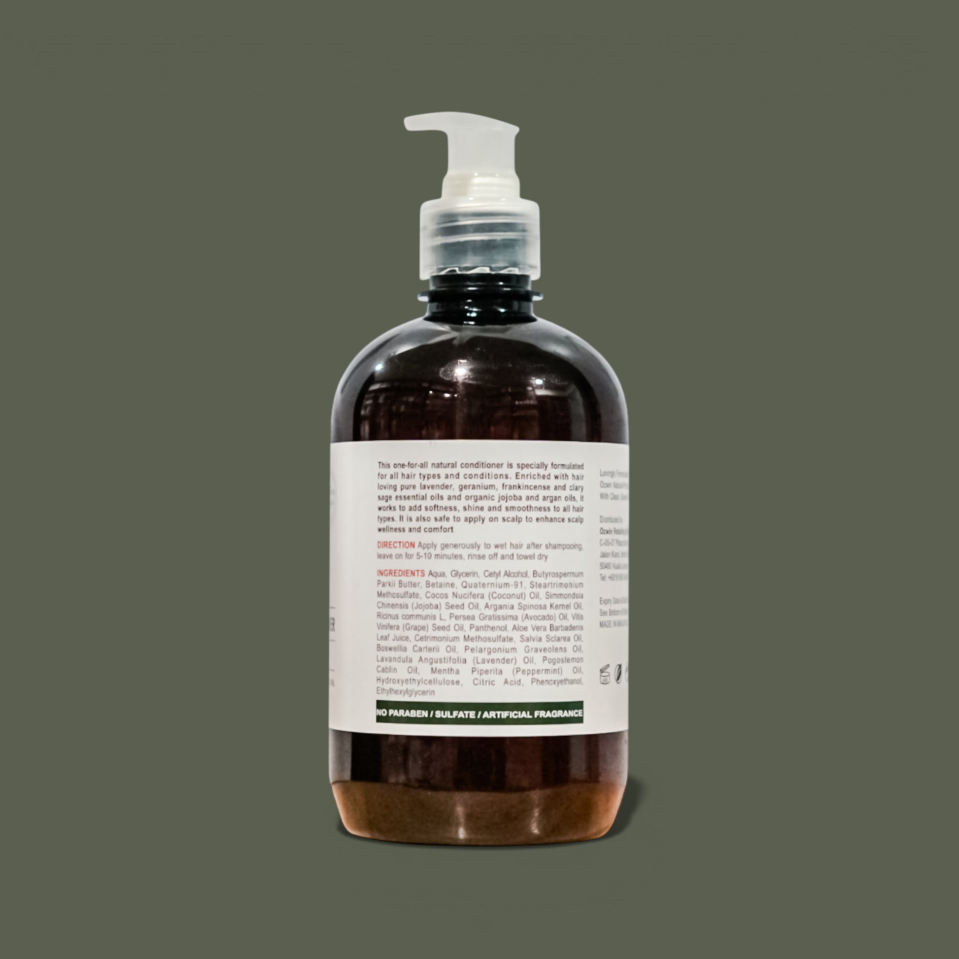 Aqua, Glycerin, Cetyl Alcohol, Butyrospermum Parkii Butter, Betaine, Quaternium-91, Steartrimonium Methosulfate, Cocos Nucifera (Coconut) Oil, Simmondsia Chinensis (Jojoba) Seed Oil, Argania Spinosa Kernel Oil, Panthenol, Aloe Vera Barbadensis Leaf Juice, Cetrimonium Methosulfate, Salvia Sclarea Oil (Clary Sage), Boswellia Carterii Oil (Frankincense), Pelargonium Graveolens Oil (Geranium), Lavandula Angustifolia (Lavender) Oil, Pogostemon Cablin Oil (Patchouli), Mentha Piperita (Peppermint) Oil, Hydroxyethylcellulose, Citric Acid, Phenoxyethanol, Ethylhexylglycerin